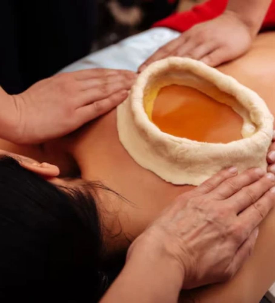 Kati Basti is a traditional Ayurvedic therapy focused on the lower back region. Warm medicated herbal oil is pooled and retained over the lumbar area using a dough boundary. The warmth and herbal action deeply penetrate the muscles, nerves, and tissues to relieve pain and stiffness.